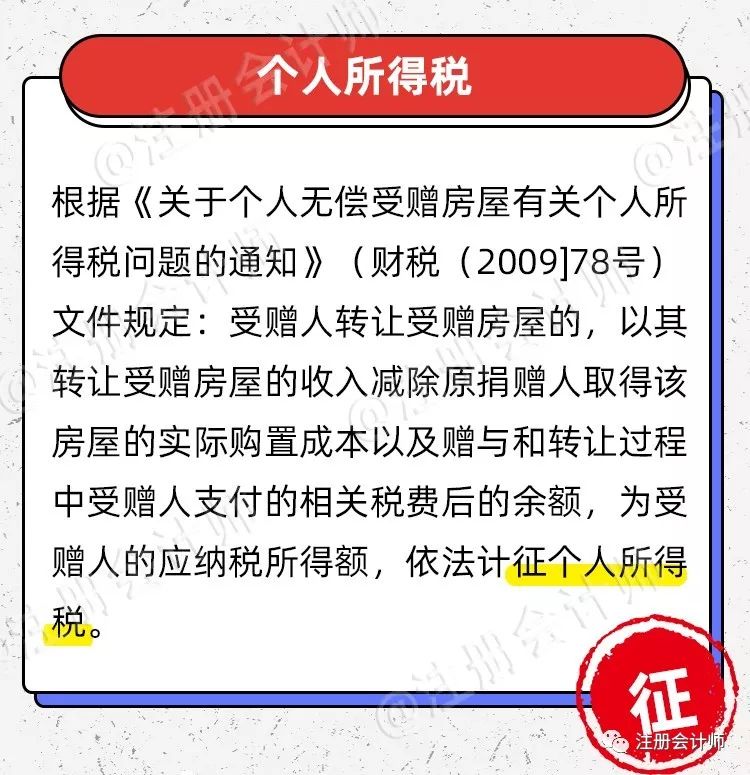 但是,事实上相关通知财政部在2009年就出过,只是今年的公告进一步确定了“房产过户应征收个人所得税”的税目,由原“按其他所得征税”改为“按偶然所得征税”,且补充了非近亲属之间的房屋赠与受赠方需按照“偶然所得”缴纳个税,按照20%的税率缴纳。