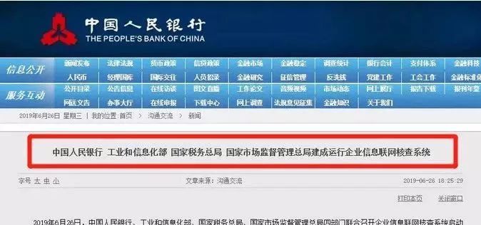 2019年6月26日,中国人民银行、工业和信息化部、国家税务总局、国家市场监督管理总局四部委联合召开企业信息联网核查系统启动会,共同运行企业信息联网核查系统。