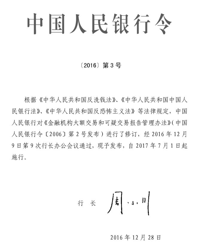 中国人民银行在2017年7月1日施行的《人民币大额和可疑支付交易报告管理办法》(银发[2016] 第3号)中对大额交易进行了定义: